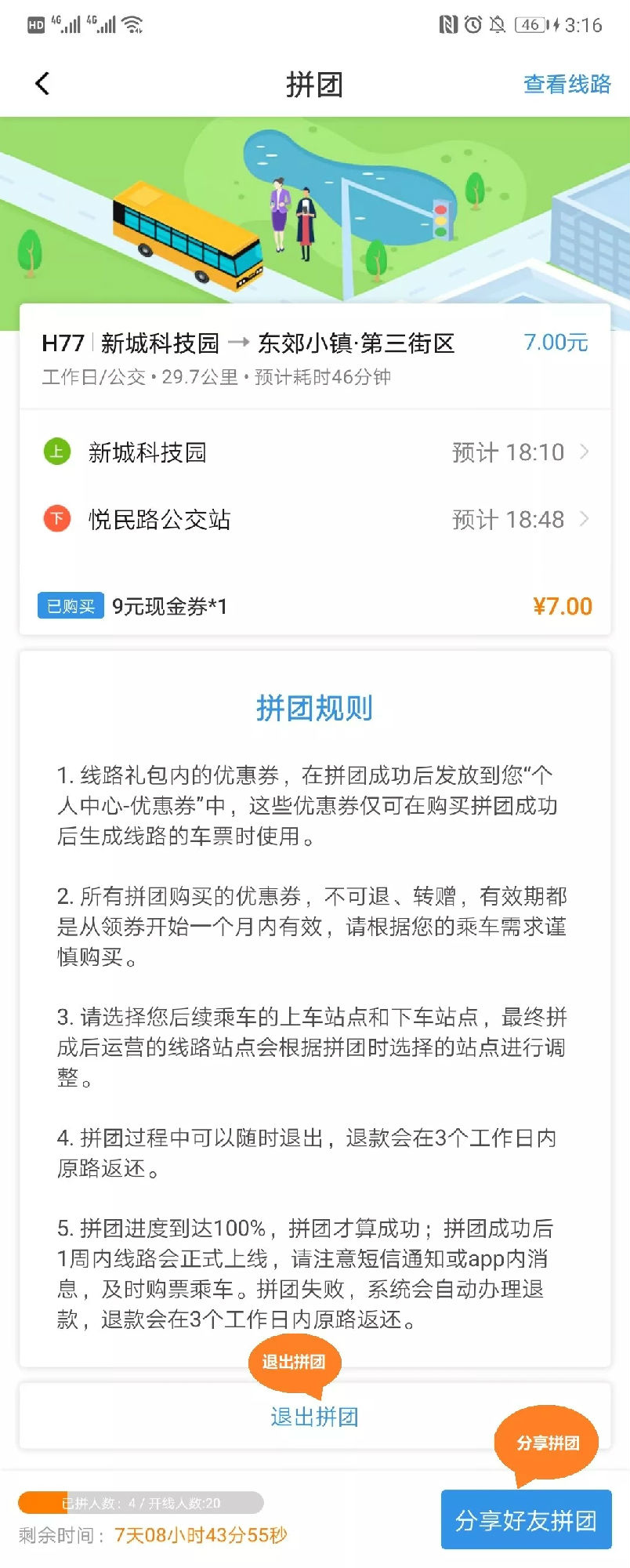 拼團(tuán)進(jìn)度達(dá)到100%之前點(diǎn)擊“退出拼團(tuán)”即可放棄拼團(tuán)系統(tǒng)都會(huì)將票款在3個(gè)工作日內(nèi)