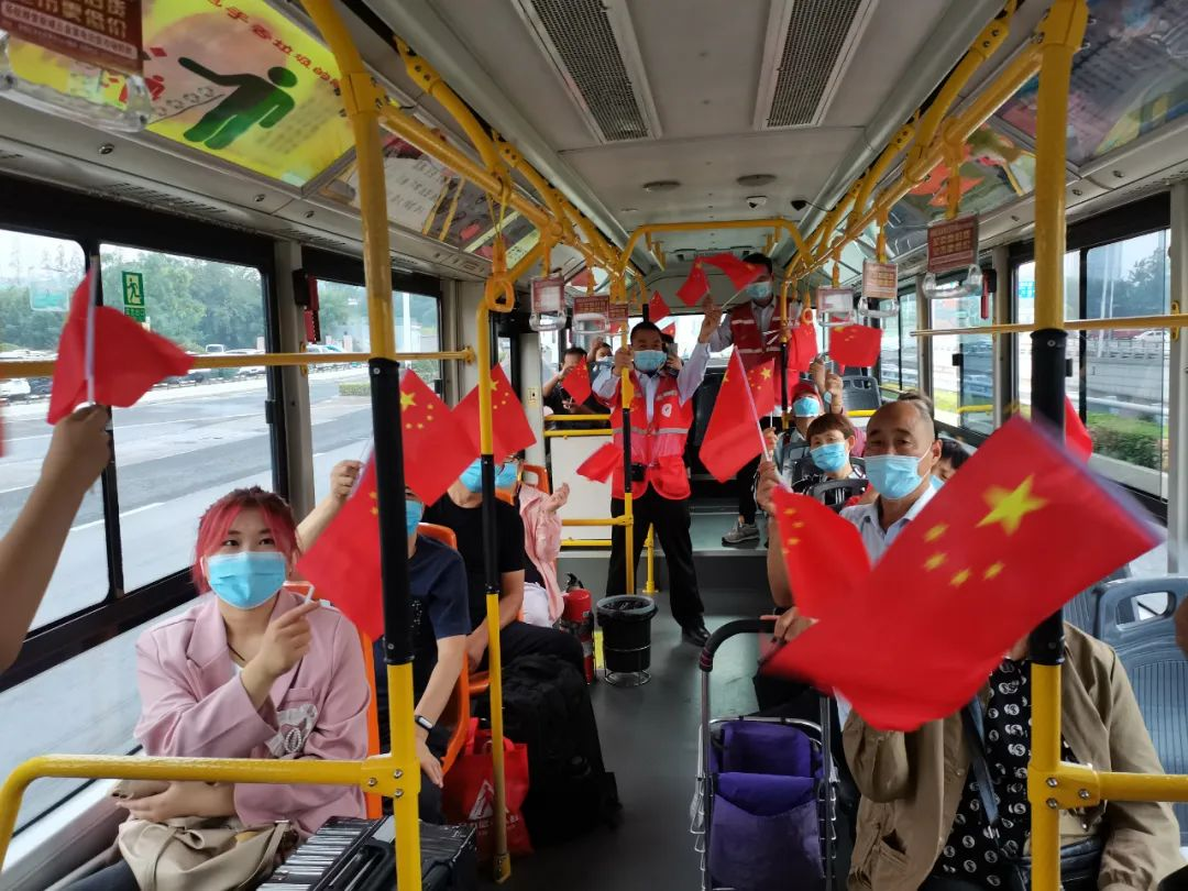 志愿者們走進公交車廂,現(xiàn)場與乘客們互動,通過提問節(jié)日和防疫小知識,獎勵口罩、紅旗、鑰匙環(huán)等小禮物,并與市民乘客們共唱《我和我的祖國》,熱鬧歡慶的氣氛感染了整個車廂,彰顯了奉獻、友愛、互助、進步的志愿精神。