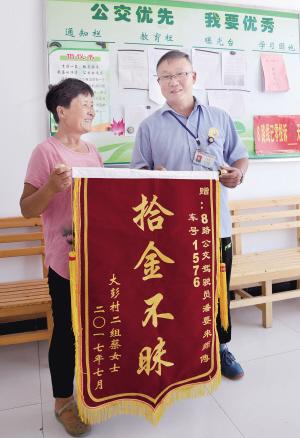7月21日《都市晨報(bào)》A08版刊登了《急匆匆出門見朋友 3000多元現(xiàn)金遺失公交上》一文,講述了8路駕駛員潘要來(lái)拾金不昧的事跡。7月19日下午,家住銅山區(qū)大彭鎮(zhèn)的蔡女士從大彭鎮(zhèn)乘坐8路車到宣武,慌忙下車后,蔡女士忽然發(fā)現(xiàn)裝3000多元錢的布包不見了。兩人回憶,當(dāng)時(shí)忙著抱孩子了,把包遺失在了公交車上。蔡女士連忙回去,找到另外一名8路車駕駛員幫她聯(lián)系了8路調(diào)度室,很快傳來(lái)好消息:包找到了。原來(lái),蔡女士乘坐的8路車駕駛員潘要來(lái)看到了座位上有一個(gè)東西,當(dāng)時(shí)他誤認(rèn)為是坐墊,后來(lái),他看到有個(gè)乘客直接奔向那個(gè)座位,一屁股坐了下來(lái),神色有些慌張。潘師傅從后視鏡看到,那個(gè)東西鼓鼓囊囊不像坐墊,便走了過(guò)去,將包拿回駕駛室。