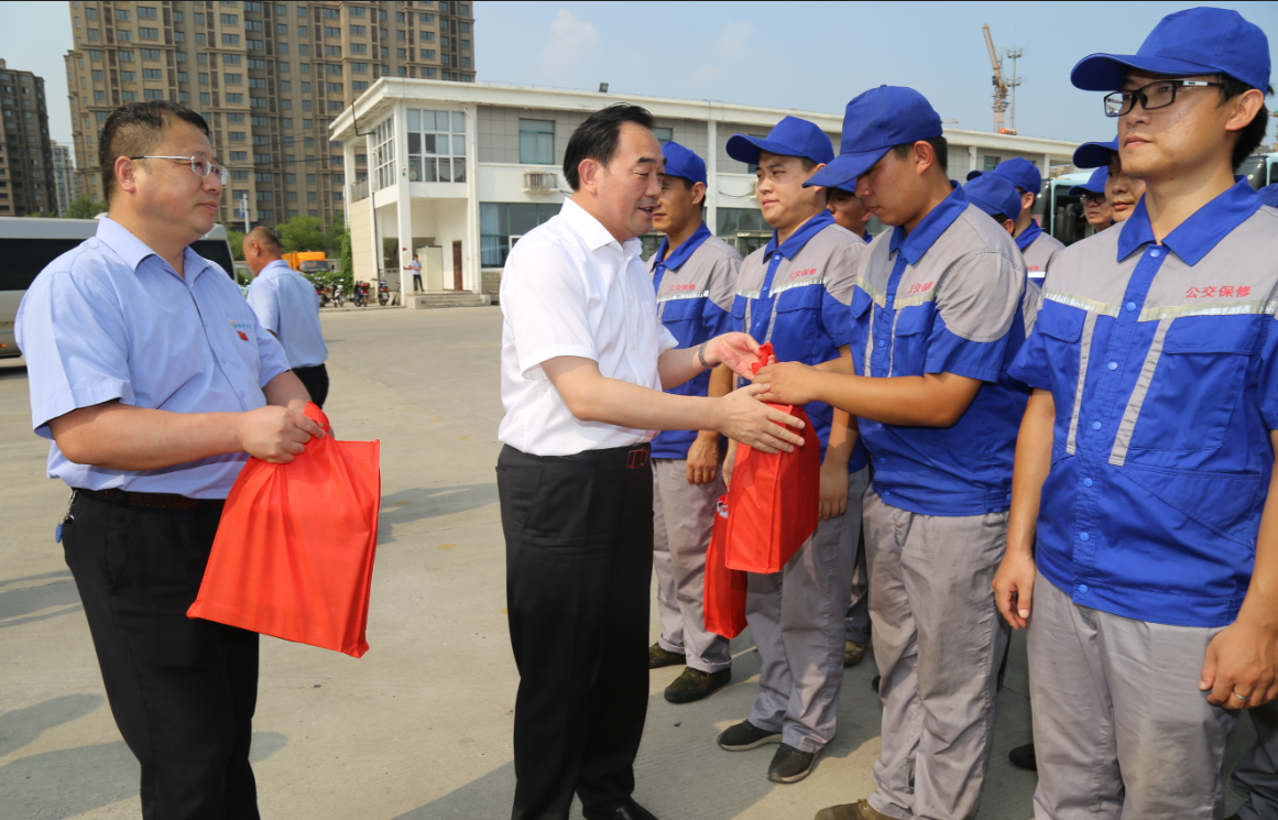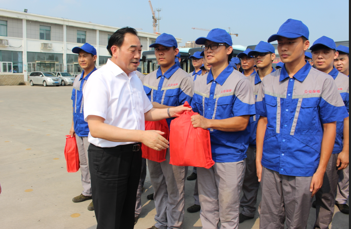 在烈日下的公交郭莊停車場,周鐵根書記看到堅守崗位的公交員工們汗流浹背,親切地上前與公交駕駛員、修理人員等一線員工一一握手?!按蠹倚量嗔耍「兄x你們!”他對廣大公交員工為保障全市人民高溫天氣正常出行所付出的辛勤勞動表示充分肯定,又將洗發(fā)水、毛巾、肥皂等降暑物品,以及《安全生產(chǎn)知識職工普及讀本》等書一一送到公交員工手中,叮囑有關(guān)負(fù)責(zé)人,要多愛護(hù)、關(guān)心一線職工,切實做好防暑降溫措施,為公交員工創(chuàng)造好的工作條件,切實維護(hù)廣大職工的安康權(quán)益,確保高溫天里職工的身體健康和安全生產(chǎn),讓職工安全度夏、清涼度夏,真正感受到黨和政府的關(guān)懷、工會組織的關(guān)心和社會各界的關(guān)愛。他還關(guān)心地叮囑公交員工們要勞逸結(jié)合,做好高溫防護(hù),保重身體,杜絕疲勞駕駛,確保安全行車,并希望大家更好地堅守崗位、服務(wù)群眾,為保障市民安全有序的出行環(huán)境,打造我市優(yōu)化營商環(huán)境、營造文明城市良好氛圍做出更大的貢獻(xiàn)。