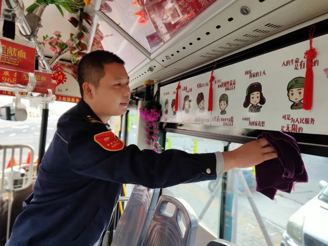 駕駛座上的王石龍雙手把住方向盤,安全平穩(wěn)駕駛著,每到一站,他都會(huì)仔細(xì)觀察乘客的上下車情況,并攙扶特需乘客坐到座位上,他用熱情的服務(wù)為乘客送去溫暖。走進(jìn)王石龍的車廂,紅色的主題格外引人矚目,扶手被用紅絲絨布套包裹得嚴(yán)嚴(yán)實(shí)實(shí),一個(gè)個(gè)的座位上整齊地放置著棉坐墊,車廂內(nèi)溫馨的感覺縈繞著乘客,感到冬日里格外的溫暖。他還自費(fèi)更新了紅色小人書,放置了醫(yī)藥箱、便民袋、針線包、速效救心丸、一次性雨衣等等,細(xì)微之處彰顯了王石龍對工作的用心和對崗位的熱愛。